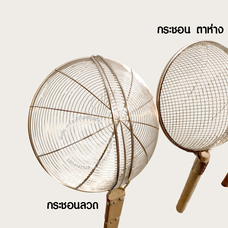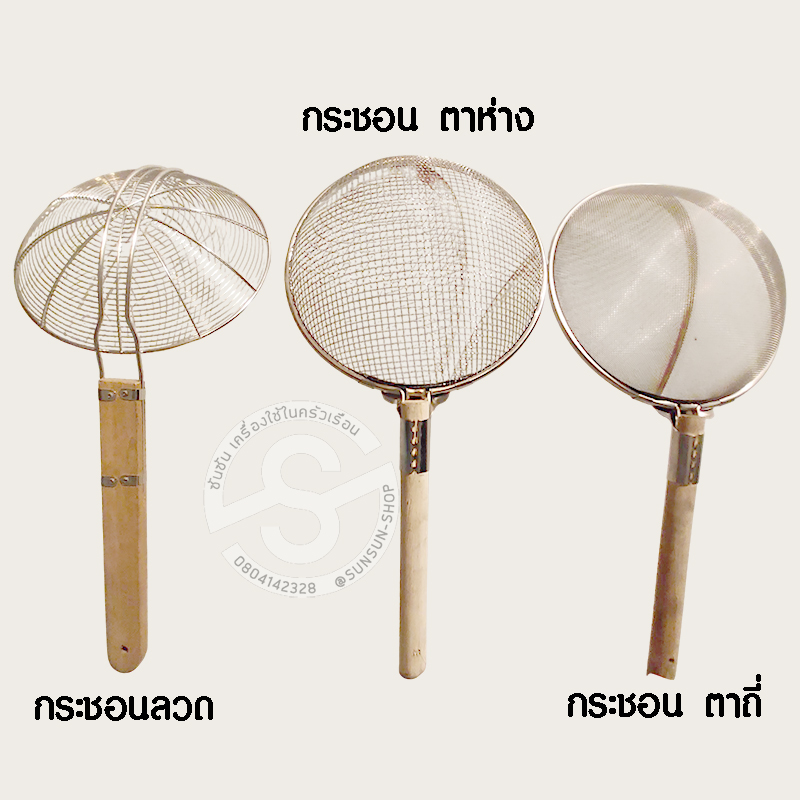 ไอเท่มหลักๆ แบบขาดไม่ได้ สำหรับร้านก๋วยเตี๋ยว หรือร้านของทอด กล้วยทอด กล้วยแขกใช่มั๊ยจ๊ะซันซันอยากนำเสนอว่า คำว่ากระชอนเนี่ย มีหลายแบบหลายขนาดมากการเลือกใช้ก็ต้องดูที่1.ปริมาณของที่จะลวก หรือทอด2.ขนาดของหม้อ หรือกระทะ3.ขนาดของของที่จะทอดหรือลวก เช่นลวกลูกชิ้น กล้วยทอด หมูทอด ก็ใช้แบบขดลวด หรือ ตาห่าง ลวกหมูสับ ตักเศษแป้งทอดก้นกระทะ ก็ใช้ตาถี่ เป็นต้น กระชอนทั้ง 3 แบบนี้ เป็นสแตนเลส ด้ามไม้ ความพิเศษที่ร้านเรามีคือ เรามีรุ่นใหญ่ ถึง 40 ซม. (หรือ 16นิ้ว) ใหญ่พิเศษ สะใจ ขายดีไปเลยจ้า